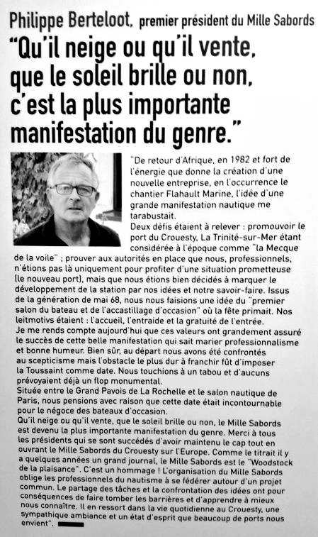Dans une négociation pour vendre un bateau neuf il faut souvent reprendre l’ancien. En septembre après le Grand Pavois de la Rochelle notre stock d’occasions est important, la trésorerie s’en ressent, alors l’idée me vient de créer un salon du bateau d’occasion dans le but d’écouler ces reprises avant le salon de Paris. La date du weekend de la Toussaint fera polémique, mais les quelques mauvais coucheurs n’entament pas ma détermination. Avec Michel Breton de la concession Bénéteau, Alain Veillard un traiteur de la zone artisanale, nous bâtissons un événement qui deviendra le plus grand salon européen du bateau d’occasion, Le Mille Sabords.